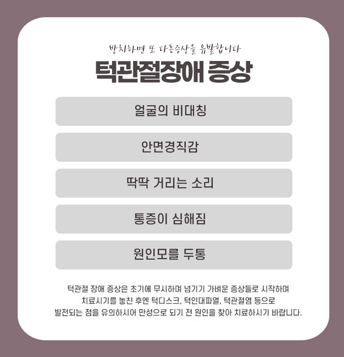 바쁘고 긴장된 일상 속에서도 잠시 멈춰 깊게 숨 쉬고, 턱과 어깨의 힘을 빼주는 습관을 들이시기 바랍니다. 그렇게 하면 턱관절은 물론 전신의 긴장도 개선되어 건강한 하루를 보내는 데 큰 도움이 될 것입니다. 작은 관심과 배려가 모여 턱관절을 지킬 수 있고, 그로 인해 식사와 대화, 웃음까지 더 편안해질 수 있다는 점을 기억하며 오늘 하루도 부드럽고 따뜻하게 보내시길 바랍니다.