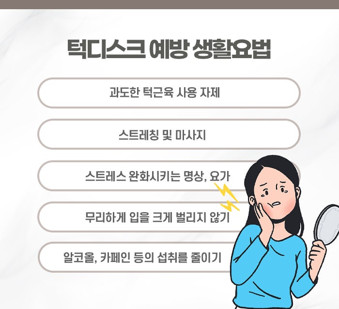 장시간 컴퓨터를 사용하거나 스마트폰을 사용할 때, 고개를 앞으로 내미는 자세는 턱에 부담을 줄 수 있습니다. 올바른 자세를 유지하고, 중간중간 쉬는 시간을 가지는 것이 중요합니다.또한 정기적인 치과 검진을 통해 치아와 턱 관절의 건강을 체크하는 것이 좋습니다. 이를 통해 치아나 턱에 문제가 생기기 전에 예방할 수 있습니다. 체중 관리도 중요한 요소입니다. 비만이나 과체중은 턱에 추가적인 부담을 줄 수 있으므로, 적절한 체중을 유지하는 것이 턱디스크 예방에 도움이 됩니다.