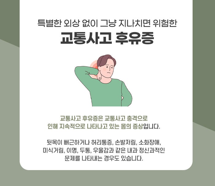 교통사고 휴유증은 교통사고로 인해 직접적인 외상이 치유된 후에도 신체적, 정신적, 혹은 기능적인 이상이 지속되거나 새롭게 나타나는 상태를 의미합니다. 사고 당시에는 외부 상처나 골절 등 명확한 손상이 드러나지 않아 특별한 이상이 없는 것처럼 보이더라도, 시간이 지나면서 통증이나 기능 저하, 감각 이상, 심리적 불안 등의 다양한 증상이 서서히 발생하거나 악화되는 경우가 많습니다. 특히 경미한 사고라고 생각되어 별다른 치료를 받지 않거나 검사 없이 방치한 경우, 수일 또는 수주 후부터 신체의 불편함이 나타나는 일이 적지 않으며, 그로 인해 삶의 질이 현저히 떨어지기도 합니다. 이러한 교통사고 후유증은 개인에 따라 증상의 종류나 정도가 크게 다를 수 있으며, 사고 당시의 충격 강도, 사고 유형, 개인 체질, 기존 질환 여부 등 다양한 요인에 의해 결정된다고 대구야간진료한의원에서는 말합니다.