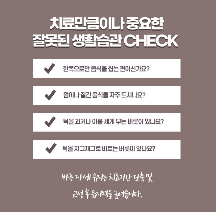 턱관절 통증은 단순한 일시적 증상이 아니라 몸이 보내는 경고 신호일 수 있습니다. 작은 불편함이라도 무시하지 말고, 내 몸의 균형을 돌아보는 계기로 삼는다면 충분히 개선할 수 있습니다. 지금 느끼는 통증이 결코 영원하지 않으며, 조금씩 자세를 바꾸고 긴장을 개선하는 습관을 들이면 턱관절은 서서히 제 기능을 되찾습니다. 꾸준한 관리와 노력은 분명히 좋은 결과로 이어질 것입니다. 턱관절은 우리의 말과 웃음, 식사 등 일상의 기쁨을 가능하게 하는 소중한 기관입니다. 스스로의 몸을 아껴주고 천천히 회복을 향해 나아간다면 어느새 통증 대신 편안한 움직임과 밝은 미소를 되찾을 수 있을 것입니다. 자신을 믿고, 몸의 회복력에 희망을 가지며 오늘도 작은 실천을 이어가시길 바랍니다.