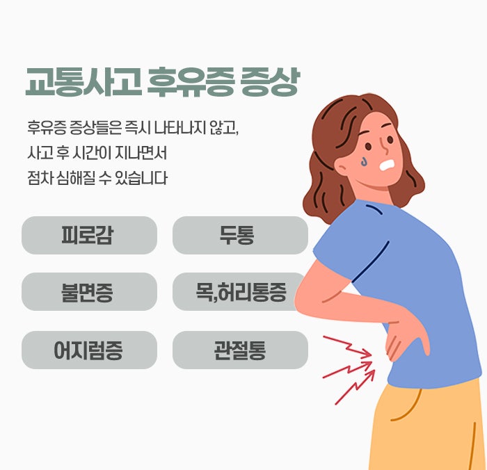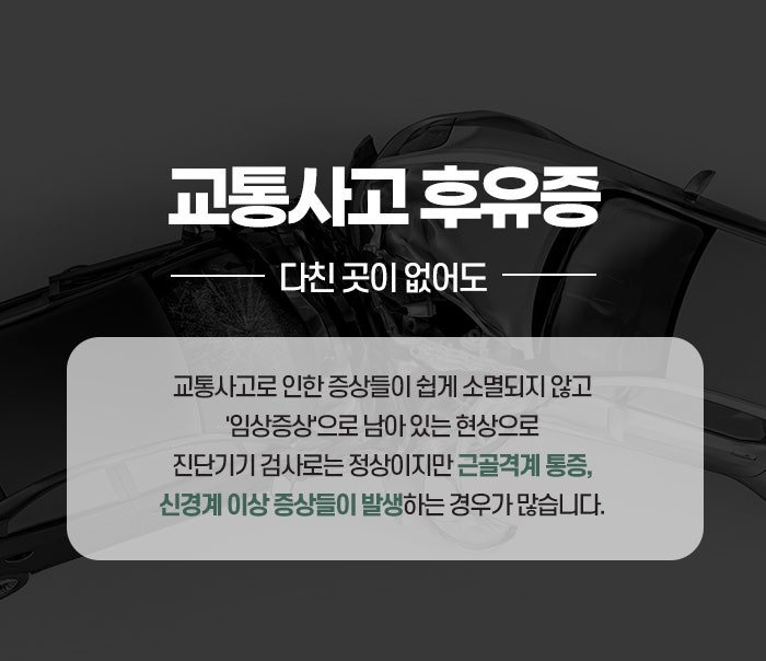 동성로야간진료한의원에서는 이를 몸속 혈액이 정체되어 맑지 못한 상태로 머무르는 어혈의 관점에서 바라보는데 사고의 충격으로 기혈의 흐름이 막히면 노폐물이 원활하게 배출되지 못하고 특정 부위에 머물며 통증을 유발하거나 전신의 무력감을 불러오는 원인이 됩니다. 또한 사고 당시의 당혹감과 공포는 자율신경계에 커다란 자극을 주어 몸이 계속해서 긴장 상태를 유지하게 만들고 이는 혈관을 수축시키며 근육의 유연성을 떨어뜨려 만성적인 불편함으로 이어지는 계기가 됩니다. 증상은 사고 후 짧게는 이삼일에서 길게는 수주가 지난 뒤에 서서히 고개를 드는 경우가 많으며 가장 흔하게는 뒷목이 뻣뻣하고 어깨가 무거우며 허리가 찌릿거리는 근골격계의 통증이 관찰됩니다.