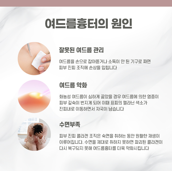 여드름 자국이나 흉터는 피부가 회복되는 과정에서 세포가 정상적으로 재생되지 못할 때 발생합니다. 한번 손상된 피부는 처음 상태로는 돌아가지 못하는데, 이 과정에서 불완전하거나 과도한 세포 생성이 일어나면서 움푹 파인 자국이나 색소 침착이 생기기 쉽습니다. 따라서 흉터를 예방하려면 여드름처럼 흔한 피부 질환이라도 가볍게 여기지 않고 반월당흉터제거 치료를 받는 것이 좋습니다. 이미 흉터가 남았다면, 등이나 가슴처럼 피부가 두껍고 회복이 더딘 부위는 특히 신중하게 관리해야 합니다. 이와 같은 부위는 손이 잘 닿지 않아 적절한 관리가 어려워 흉터가 오래 남을 수 있습니다.
