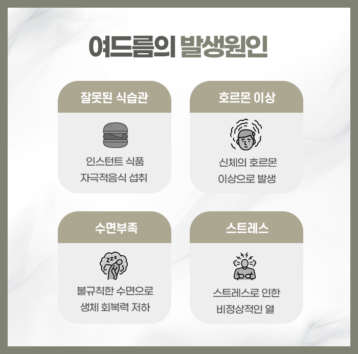 최근에는 현대인들의 불규칙한 생활 리듬과 고열량 위주의 식단 그리고 가공식품의 섭취가 체내의 호르몬 체계를 자극하여 피지 분비량을 더욱 부추기는 결과를 낳고 있으며 미세먼지와 같은 외부 오염 물질이 피부 표면의 노폐물과 엉겨 붙어 모공의 호흡을 방해하는 것도 커다란 이유로 꼽힙니다. 또한 정신적인 긴장감이 지속되면 몸속에서 스트레스 조절을 담당하는 물질들이 분비되는데 이것이 피지선을 직접적으로 자극하여 피부 상태를 예민하게 만들고 자생력을 떨어뜨리는 계기가 되기도 하여 대구여드름한의원에서는 설명합니다. 나타나는 모습은 초기 단계에서부터 심화 단계에 이르기까지 매우 다채로운데 처음에는 모공 속에 피지가 알갱이처럼 맺히는 면포 현상으로 시작되며 이는 손으로 만졌을 때 오돌토돌하게 느껴지는 작은 돌기 형태를 띱니다.