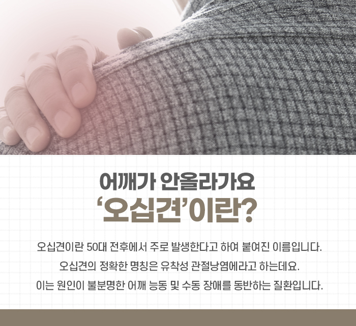 40-60대 여성에게 주로 발생하는 오십견은 어깨가 얼어붙은 것처럼 굳어 져‘동결견’이라고도 불립니다. 대수롭지 않게 생각해 그냥 넘기는 분들도 많지만 치료하지 않으면 예후가 좋지 않은 힘든 질환입니다.