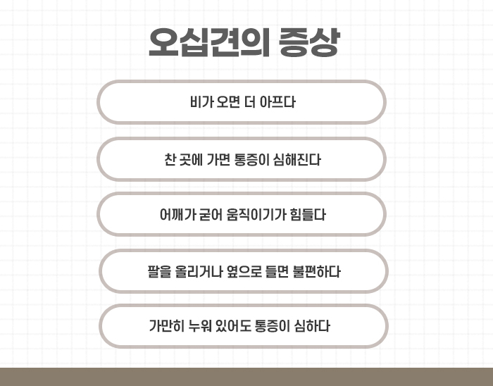 오십견의 정확한 병명은 ‘유착성관절낭염’인데요. 일반적인 회전근개건염과는 다르게 특별한 외상이 없이 어깨가 아프고 운동하기가 힘들며, 굳은 정도에 따라서 팔을 아무리 회전시키려 해도 돌아가지 않는 증상이 나타납니다. 어깨를 둘러싼 관절주머니 전체의 염증이 심해져 굳은 질환이기에 팔을 들어 올리거나 회전이 불가능해지는 증상이 나타나게 된다고 동성로오십견치료한의원에서는 말합니다.