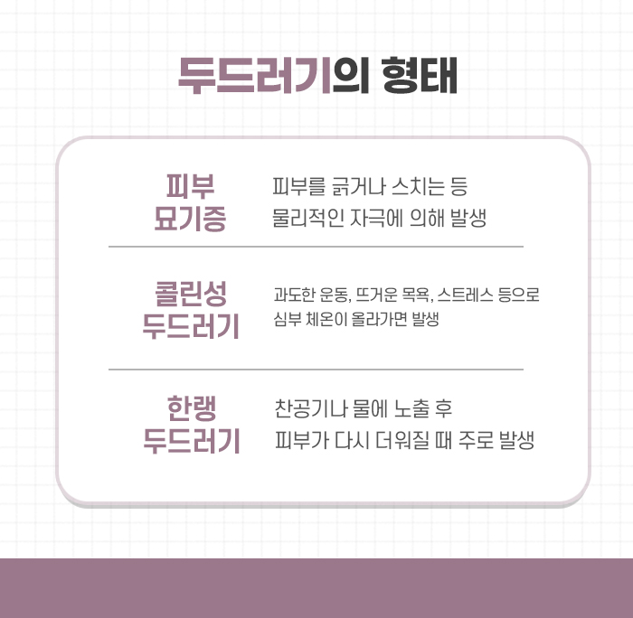 특히 요즘처럼 차가운 공기가 피부에 닿았다가 실내 온기에 다시 노출되는 환경에서는 한랭 두드러기가 흔히 나타납니다. 반월당두드러기 반응은 붉게 발진이 일어나는 홍반과 피부가 부풀어 오르는 팽진 및 가려움증으로 알아볼 수 있습니다. 심한 경우 염증과 진물이 동반되기도 하고, 복통이나 구토, 어지러움 등 유형과 원인에 따라 다른 증상으로 이어지기도 합니다. 보통 6주를 기준으로 증상이 일시적으로 나타났다가 사라지는 경우를 급성, 사라지지 않고 지속되는 경우를 만성으로 봅니다.