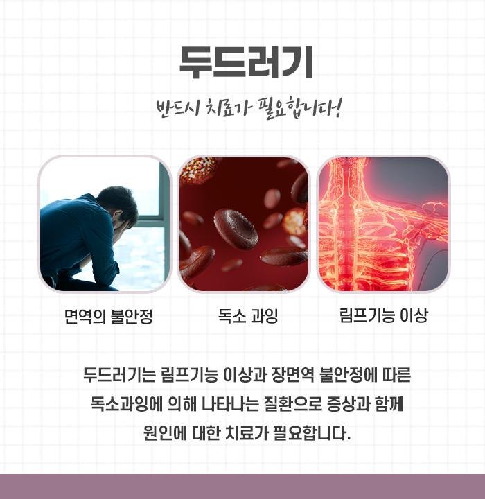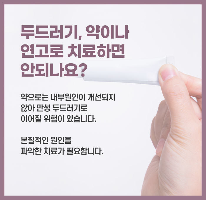 반월당두드러기 증상이 심하거나 만성으로 이어질 경우 가려움으로 잠을 이루지 못해 수면 장애가 발생할 수 있고, 홍반이 얼굴이나 목, 팔과 같이 눈에 띄는 부위에 나타나면 심리적인 위축감을 받을 수 있습니다. 그러나 원인을 알지 못한 채 항히스타민제 등을 사용해 겉으로 보이는 증상만 가라앉히려 하면 약에 대한 내성이 생기거나 2차 질환으로 이어질 가능성도 존재합니다. 그렇기 때문에 증상이 나타나면 조기에 치료를 받는 것이 좋습니다. 한방에서는 이를 피부 문제뿐만 아니라 면역 체계의 균형과도 관련이 있을 수 있다고 말합니다.