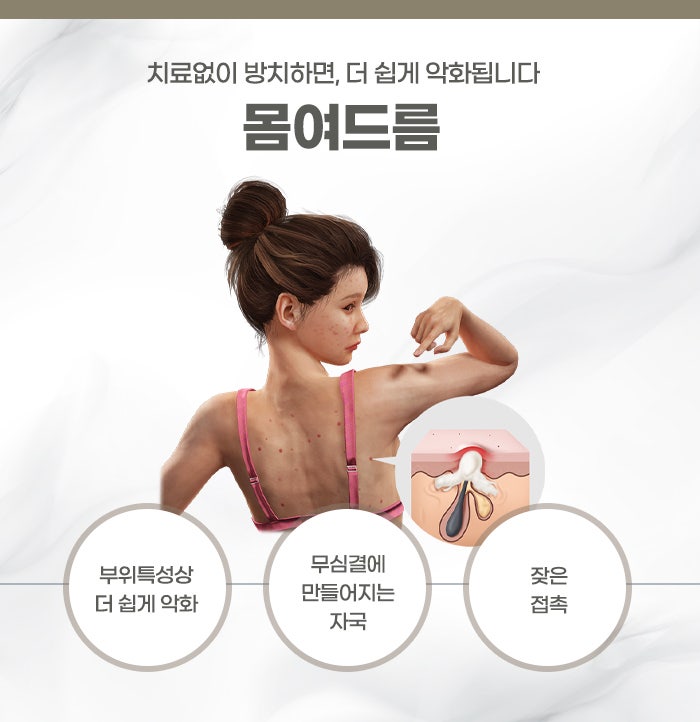 피부에 자극을 주지 않고, 적절한 관리와 올바른 생활 습관을 유지하는 것이 핵심입니다. 자신에게 맞는 관리법을 찾아 꾸준히 실천한다면, 건강하고 깨끗한 피부를 유지할 수 있습니다. 몸 여드름을 더 이상 고민하지 않고, 자신감을 되찾아보시기 바랍니다.