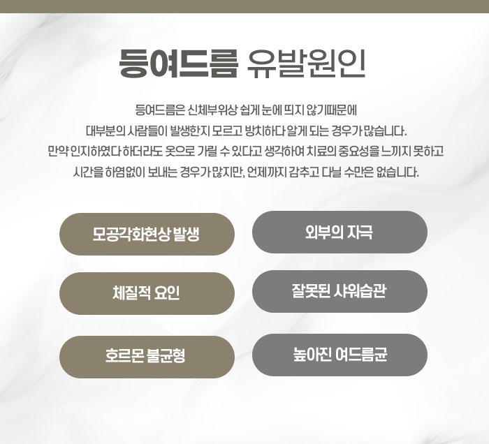 반월당등여드름은 때로 불편한 옷이나 너무 꽉 끼는 옷으로 인해 생길 수 있습니다. 특히 스포츠 의류, 합성 섬유로 된 옷은 땀을 흡수하지 않아서 땀이 피부에 쌓이게 하고, 이로 인해 여드름이 발생할 수 있습니다. 얼굴에는 비누와 클렌징 제품을 사용하지만, 몸에는 같은 방법으로 세안하지 않거나, 피부에 맞지 않는 제품을 사용할 경우 피부가 자극을 받아 여드름이 생길 수 있습니다. 특히 기름기가 많은 바디로션이나 향이 강한 제품을 사용할 때는 피부가 막히거나 자극을 받을 수 있습니다.