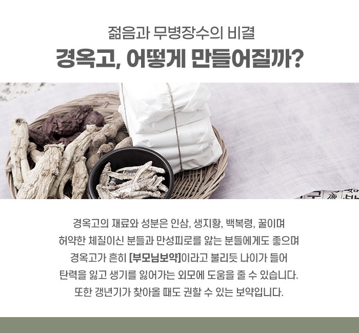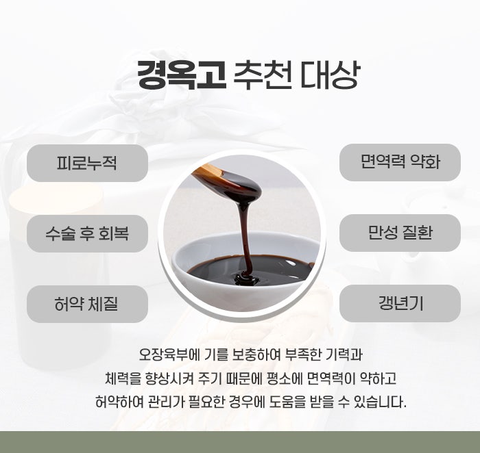 실제로 임상에서는 경옥고가 피로감 감소, 수면의 질 향상, 식욕 증진, 면역세포 활성화 등의 효능이 보고된 바 있습니다.