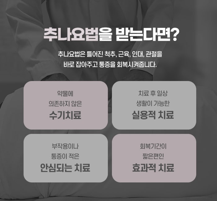 추나요법의 가장 큰 장점은 근본적인 원인을 직접적으로 다루는 치료라는 점입니다. 단순히 통증을 억제하거나 증상만을 개선하는 방식이 아니라, 통증의 원인이 되는 척추나 관절, 골반 등의 구조를 교정하여 뿌리부터 문제를 치료하려는 접근입니다. 이로 인해 약물에 의존하지 않고도 통증을 개선하고 기능을 회복시킬 수 있으며, 장기적으로는 재발을 방지하는 데에도 도움이 됩니다. 또한 비교적 비침습적인 치료입니다. 반복적인 동성로한의원추나요법 치료를 통해 점차 몸의 균형이 바로잡히면서 만성 통증 환자들이 오랜 시간 겪어온 증상들에서 벗어나는 사례도 많습니다. 추나요법은 단독으로 쓰이기도 하지만, 침, 뜸, 한약, 약침, 물리치료 등과 함께 병행할 경우 좋습니다. 예를 들어 허리디스크 환자에게 추나요법으로 틀어진 골반과 요추의 배열을 바로잡고, 한약으로 디스크 주위의 염증을 가라앉히며, 침으로 경혈을 자극해 통증을 줄이면 훨씬 빠른 회복이 가능합니다.