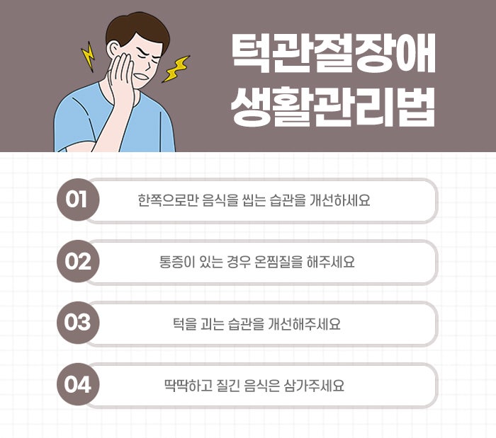 턱관절 장애는 조기에 발견하고 적절히 관리하면 충분히 호전될 수 있는 질환입니다. 따라서 평소 자신의 턱 상태에 관심을 갖고, 이상 징후가 있을 경우 상담을 받는 것이 중요합니다. 또한, 반복적인 통증이나 소리를 단순히 피곤함이나 일시적인 현상으로 치부하지 말고, 꾸준한 관찰과 치료를 통해 턱관절의 기능을 회복하고 삶의 질을 높이는 노력이 필요합니다. 턱은 단순히 음식을 씹는 기관이 아니라 전신 건강과도 밀접한 관련이 있으므로, 그 기능 유지에 관심을 기울이는 것이 바람직합니다.