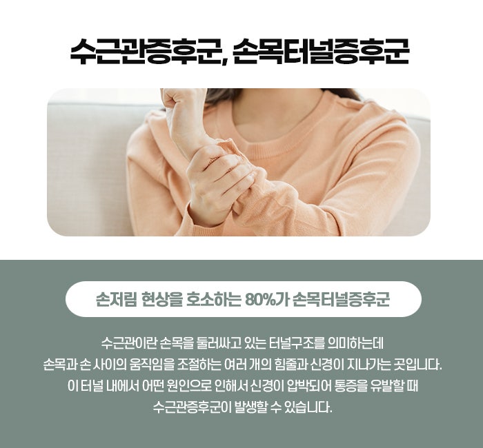 손목터널증후군은 반월당손목통증의 대표적인 질환 중 하나로, 정중신경이 손목 부위에서 눌리면서 생기는 증상입니다. 정중신경은 손바닥의 엄지손가락부터 약지 반절까지의 감각을 담당하는 신경으로, 손목을 지나 손으로 연결되는데, 이 신경이 지나는 통로를 손목터널이라고 부릅니다. 이 통로가 좁아지거나 염증 등으로 압박되면 신경이 눌리면서 통증, 저림, 감각 저하, 힘 빠짐 등의 증상이 나타나게 됩니다. 특히 밤이나 새벽에 손이 저리거나 아파서 잠에서 깬다든지, 물건을 들다가 자주 놓친다면 손목터널증후군을 의심해 볼 수 있습니다.
