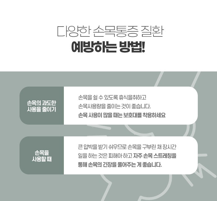 또한 손목을 사용하는 운동이나 무거운 물건을 자주 드는 경우에는 손목 보호대를 착용하여 손목을 지지해주는 것이 도움이 될 수 있습니다. 손목 보호대는 손목의 움직임을 제한하여 갑작스러운 충격이나 움직임으로 인한 손상을 예방하는 데 효과적이며, 증상이 있는 경우에도 손목을 안정시켜 통증을 개선할 수 있습니다.