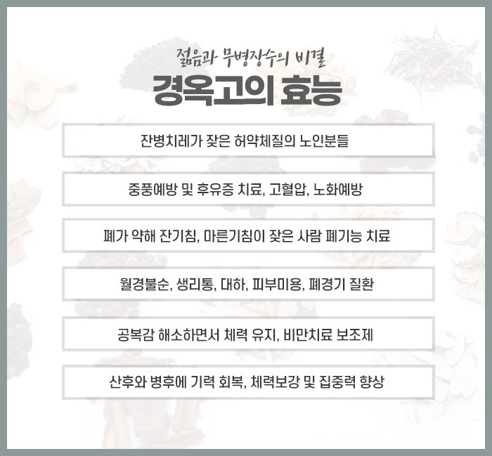 우리의 몸은 회복과 균형을 이루고자 하는 힘을 항상 가지고 있으며, 경옥고는 그 과정을 돕는 소중한 동반자가 되어 삶을 보다 건강하고 활기차게 만들어 줄 수 있습니다. 오늘의 작은 관심과 노력은 내일의 활력과 건강으로 이어지며, 스스로를 따뜻하게 돌보는 마음이 가장 큰 힘이 됩니다.
