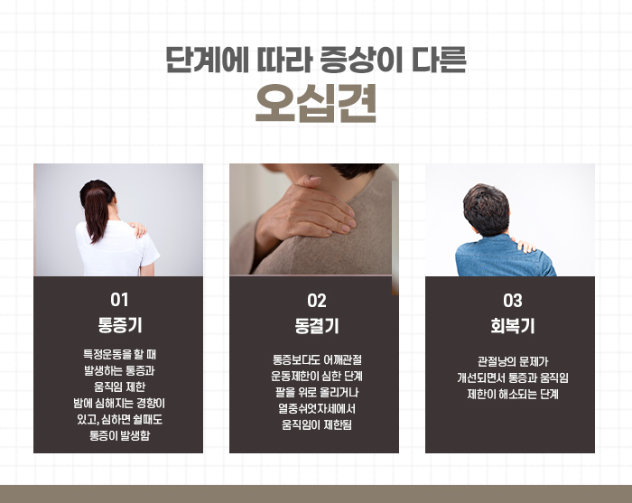 오십견의 정확한 병명은 ‘유착성관절낭염’인데요. 일반적인 회전근개건염과는 다르게 특별한 외상이 없이 어깨가 아프고 운동하기가 힘들며, 굳은 정도에 따라서 팔을 아무리 회전시키려 해도 돌아가지 않는 증상이 나타납니다. 어깨를 둘러싼 관절주머니 전체의 염증이 심해져 굳은 질환이기에 팔을 들어 올리거나 회전이 불가능해지는 증상이 나타나게 된다고 동성로오십견치료한의원에서는 말합니다.