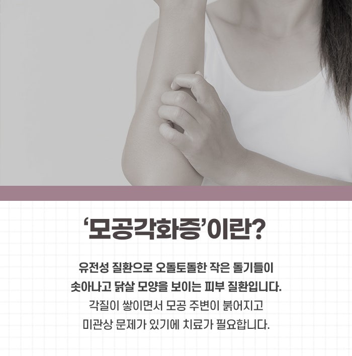 팔, 허벅지, 엉덩이, 심지어 얼굴에 작은 뾰루지처럼 오돌토돌하게 올라오는 피부 트러블로 고민 중이신가요? 여드름 같기도 하고, 때로는 건조하고 가렵기까지 한 이 증상은 단순한 트러블이 아니라 모공각화증일 수 있습니다. 흔히 ‘닭살’이라고 불리며 많은 사람들이 겪는 피부 질환이지만, 치료가 어렵거나 장기화되기 쉬워 조기에 동성로피부관리와 정확한 접근이 중요합니다. 모공각화증은 피부의 각질이 과도하게 생성되며 모공을 막아 생기는 만성 피부 질환입니다 팔, 허벅지, 등, 엉덩이처럼 피지선이 적고 마찰이 많은 부위에 잘 생기며, 오돌토돌한 피부, 붉은 반점, 건조감, 가려움 등의 증상이 나타납니다.