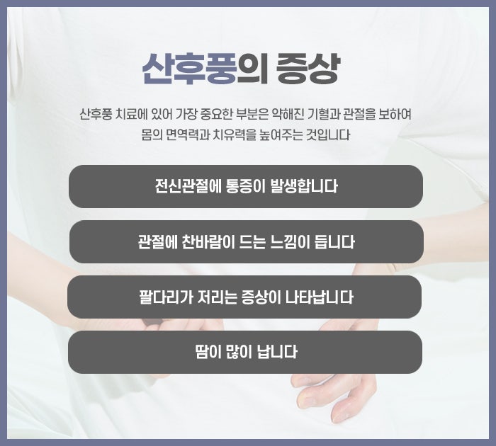 산후풍의 대표적인 증상은 관절통과 근육통입니다. 어깨, 무릎, 손목, 허리, 목 등 몸 곳곳에서 통증이 발생하며, 특정 부위에 국한되지 않고 전신적으로 나타나는 경우도 많습니다. 특히 손목과 무릎은 아이를 안고, 수유하고, 집안일을 하는 과정에서 반복적으로 사용되기 때문에 통증이 더 심하게 느껴질 수 있습니다. 이 외에도 손발 저림, 한기, 땀이 자주 나거나 오한, 만성피로, 어지러움, 소화불량, 불면증, 우울감 등의 전신 증상이 동반되기도 하여 반월당산후조리가 중요합니다. 이러한 증상은 대부분 출산 후 수주 이내에 나타나지만, 시간이 지나면서 점점 심해지거나 만성화되는 경우도 많습니다. 특히 “몸이 바람만 스쳐도 아프다”, “날씨가 흐리거나 비 오는 날엔 더 욱신거린다”는 식의 표현으로 불편함을 호소하는 산모들이 많습니다. 이는 체내에 찬 기운이 머물러 관절과 근육의 기혈 순환을 방해하고, 회복되지 못한 몸 상태가 점차 만성적인 통증과 이상 반응으로 이어졌다는 것을 의미합니다.