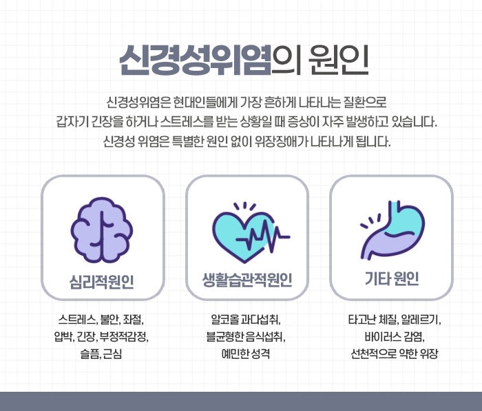 신경성위염은 정신적, 정서적인 스트레스가 주요 원인이 되어 위점막에 염증이 발생하거나 위기능이 저하되는 상태를 말하며, 일반적인 위염과는 달리 육체적 원인보다는 심리적 원인이 중심이 되는 기능성 질환입니다. 신경성위염은 정확한 의학 용어라기보다는 일상생활에서 자주 쓰이는 표현으로, 의학적으로는 기능성 소화불량이나 스트레스성 위장질환 등의 개념에 가깝습니다. 신경성위염은 위내시경 검사나 피검사, 조직검사 등에서 뚜렷한 염증이나 기질적 병변이 발견되지 않는 경우가 많음에도 불구하고 환자가 위장에 불편감을 지속적으로 호소하는 것이 특징이며, 이러한 증상은 스트레스가 심해지거나 심리적인 긴장이 높아질 때 더욱 두드러지게 나타나기에 반월당신경성위염치료가 필요합니다.